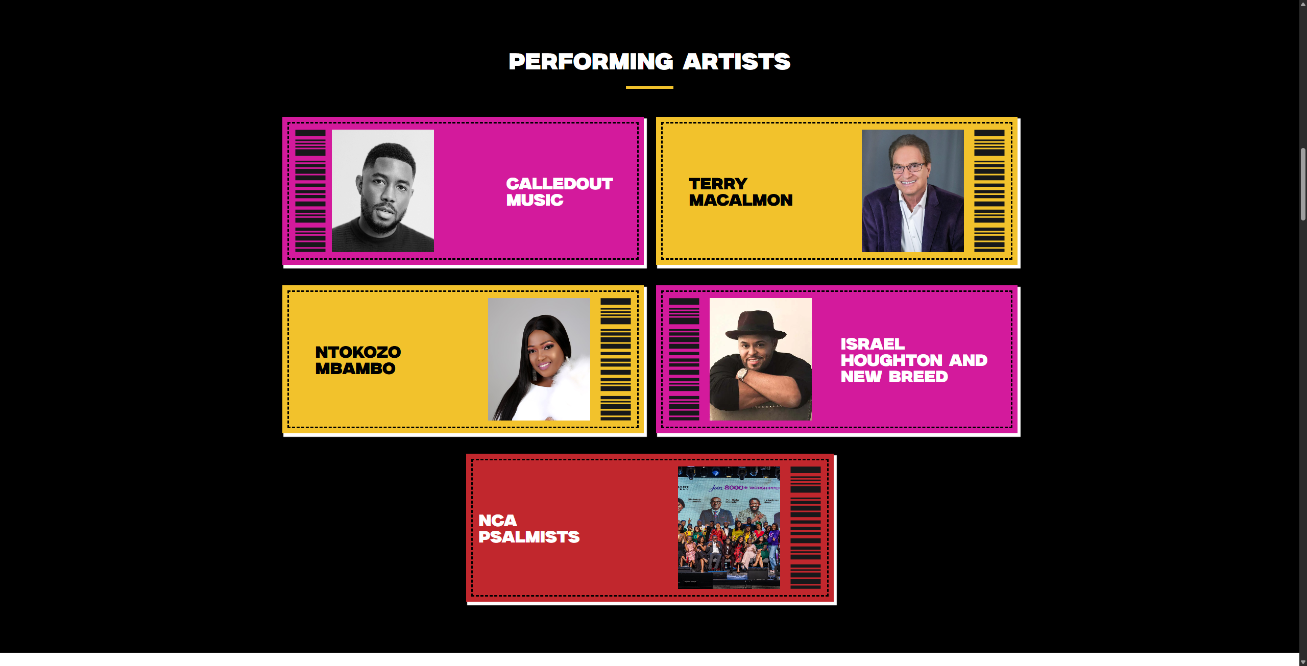 The site uses a bold black background with gold and white typography — deliberately evoking a premium concert or worship event rather than a conventional church website. Large headline typography, full-bleed concert photography, and event-ticket-style layout elements give the site a visual identity distinct from anything in the local faith community digital space. The yellow/gold ticket-card design for the venue section is a standout detail — practical and visually memorable simultaneously.