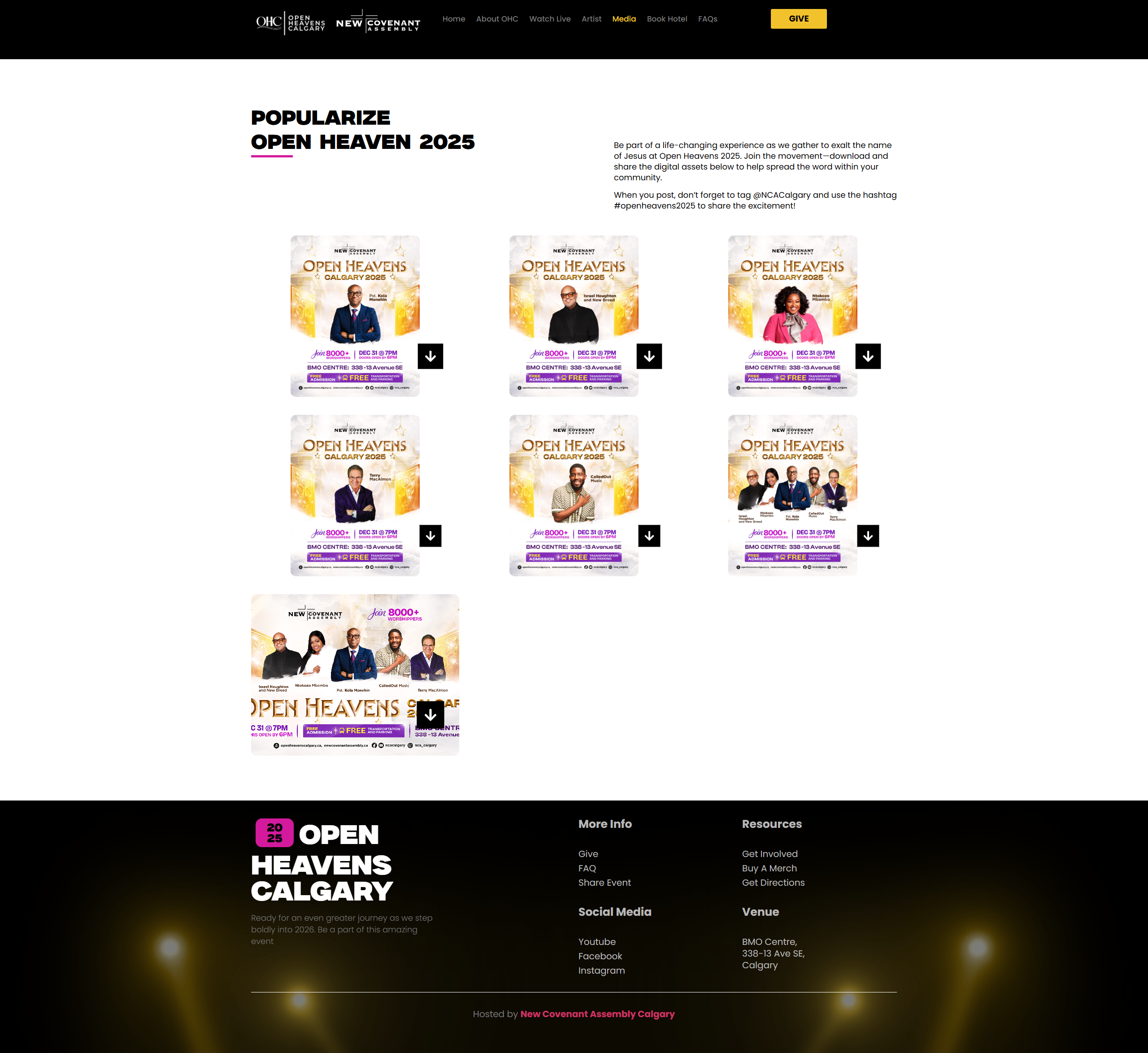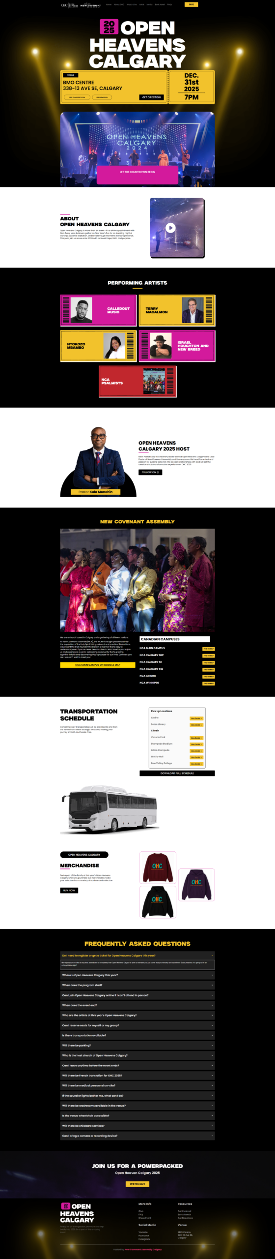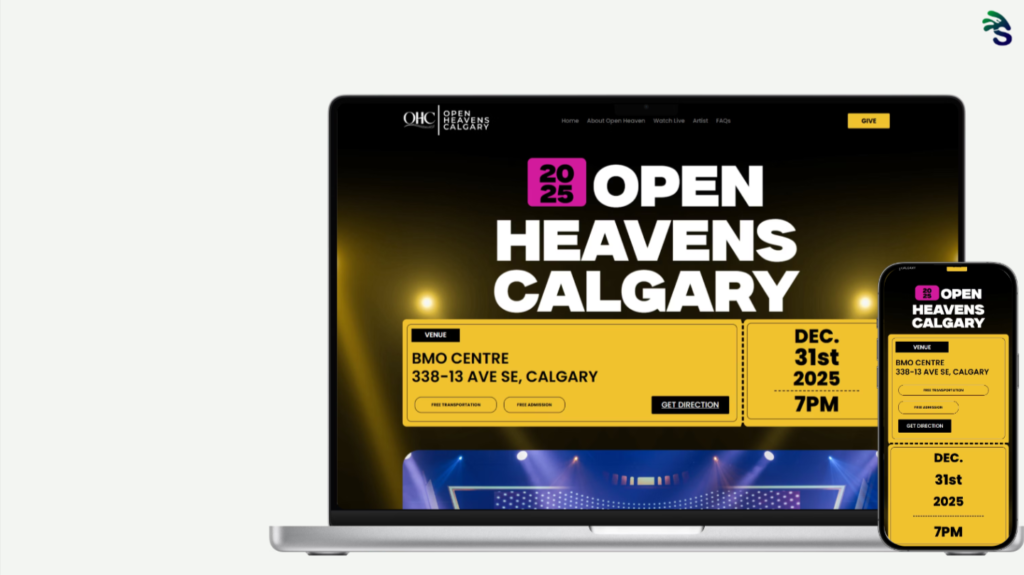 Open Heavens Calgary is a major annual worship and praise event organized by New Covenant Assembly, held at the BMO Centre in Calgary, Alberta. The event brings together thousands of attendees for a New Year’s Eve celebration featuring live performances from nationally and internationally recognized gospel artists alongside prayer, worship, and community gathering. Swash Digital designed and built the complete event website from concept to launch.