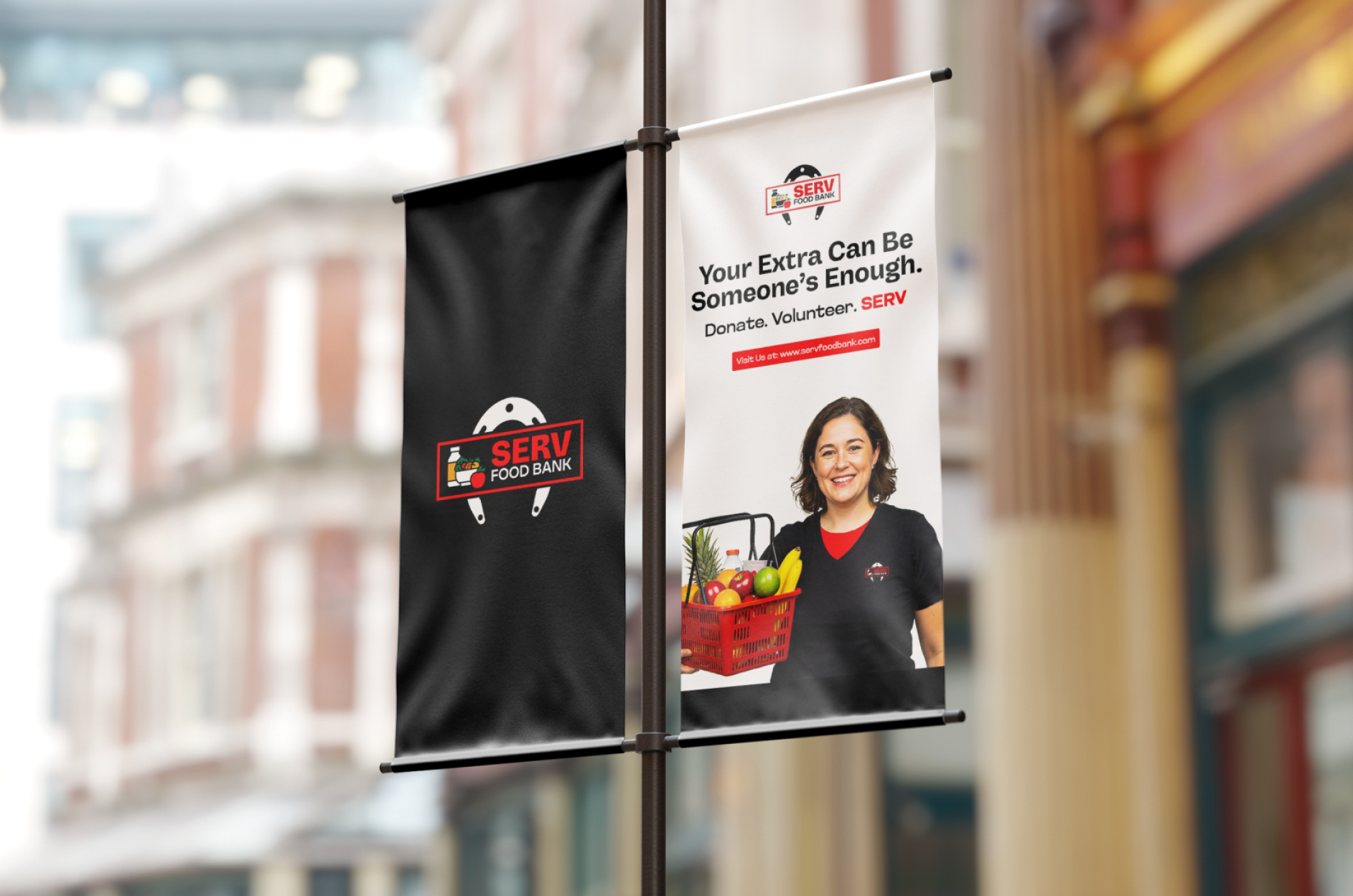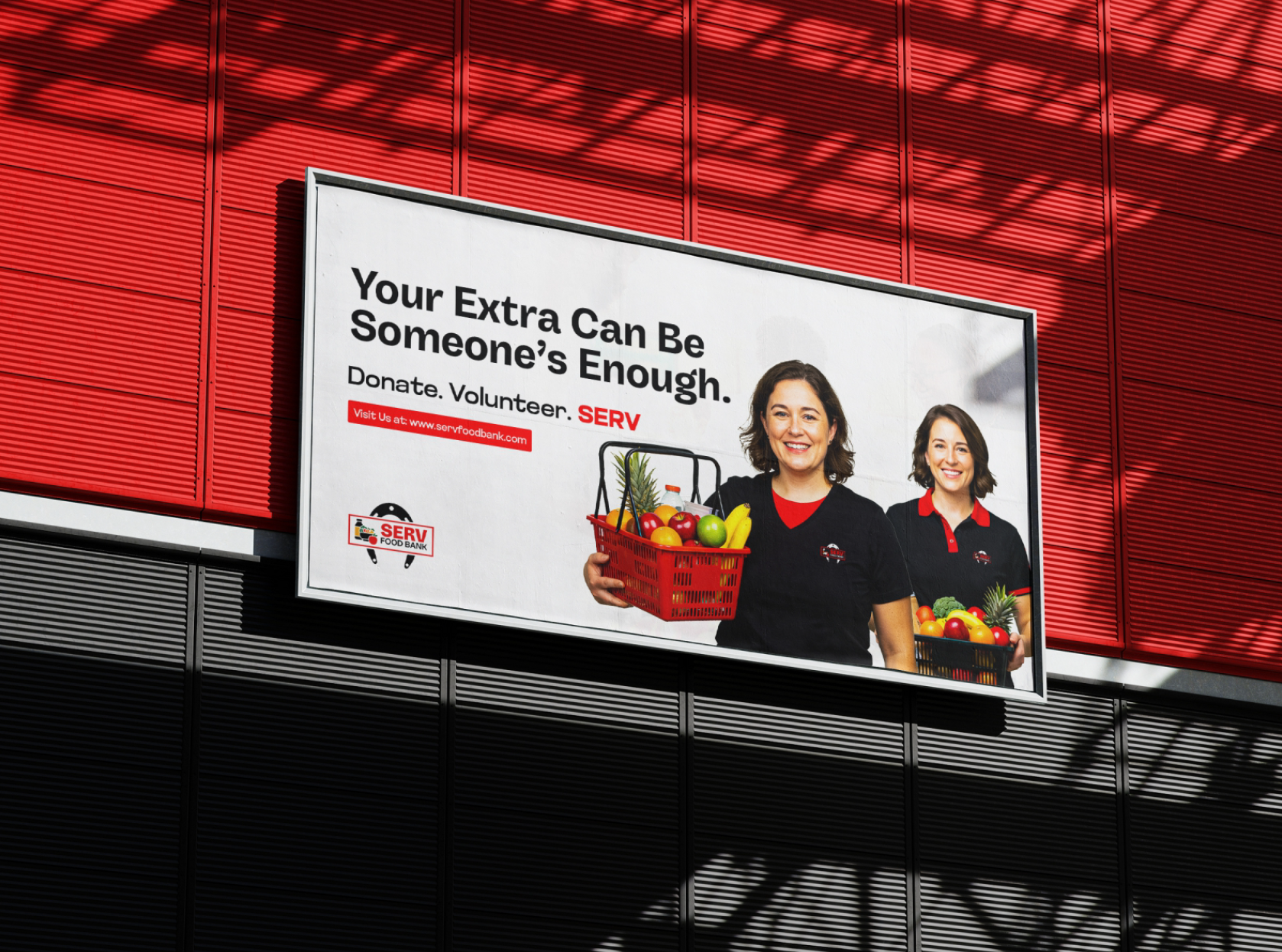 SERV Food Bank uses red as its primary brand colour — warm, energetic, and communicating urgency and community simultaneously. The logo incorporates produce imagery (vegetables, fruit) to immediately communicate purpose. The website layout prioritizes accessibility, ensuring someone in urgent need can find intake information without friction, while donors and volunteers can quickly understand how to get involved. Clean, uncluttered, and purposeful throughout.